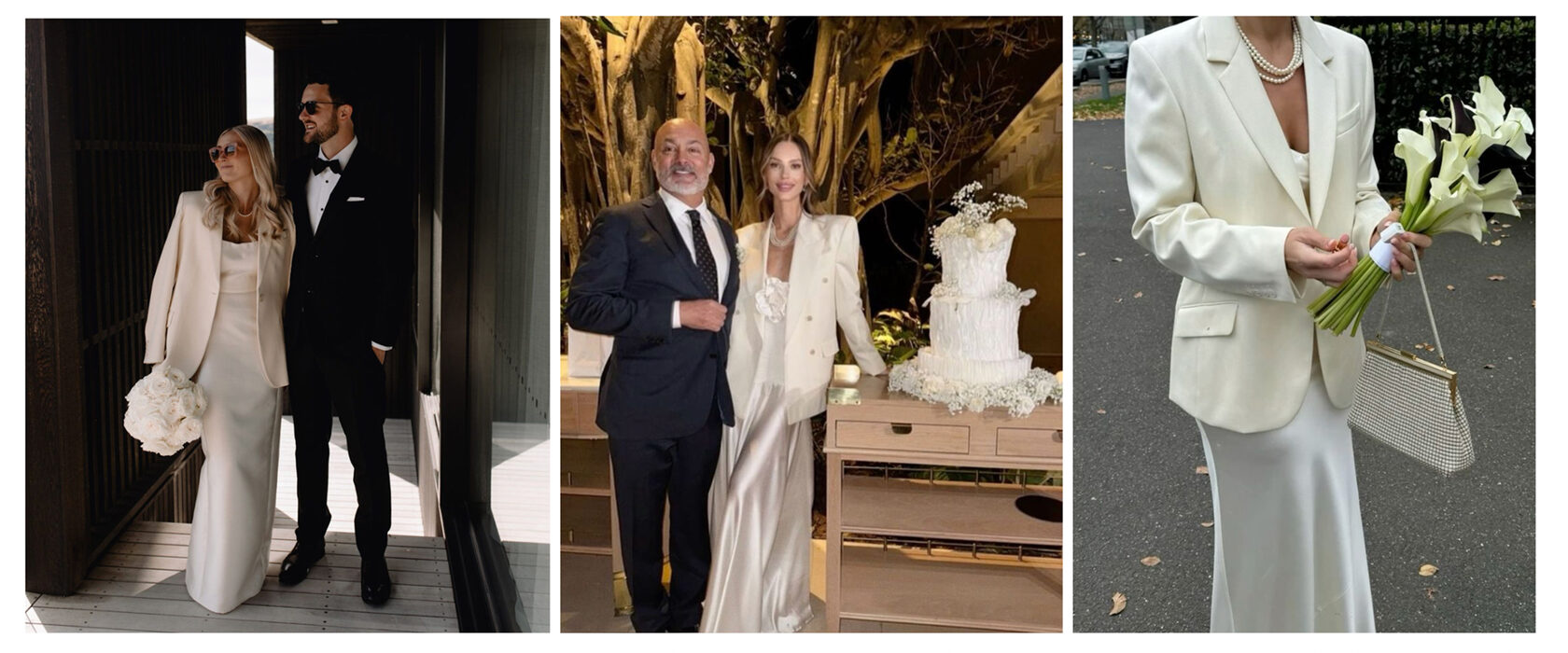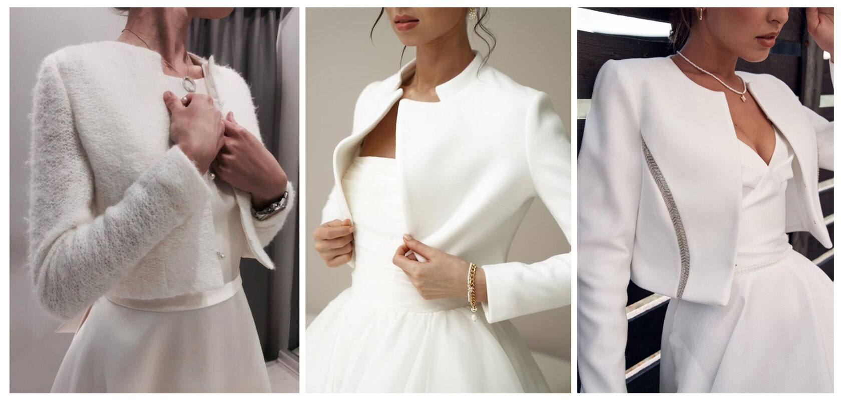 Pro odvážné a moderní nevěsty je skvělou možností bílé sako přes šaty. Nejlépe vynikne v kombinaci s jednoduchými, rovnými šaty z pevnější látky nebo saténu. Tento styl spojuje strohost a něhu a působí velmi trendy.